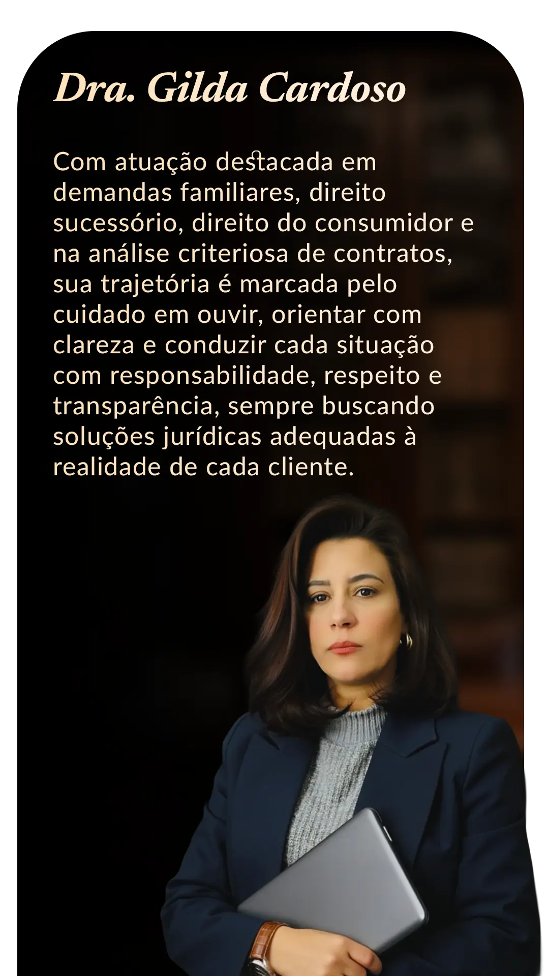 Orientação jurídica clara e personalizada para proteger seus direitos, seu patrimônio e sua família. Atendimento humanizado em diversas áreas do Direito.